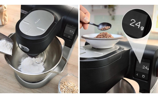 • Интегрирана везна: Показва стъпки от 1 g, измерва допълнително ml, ml мляко, ml масло, g, oz и lbs, оптимизирана за претегляне отгоре или просто директно в купата или аксесоарите.