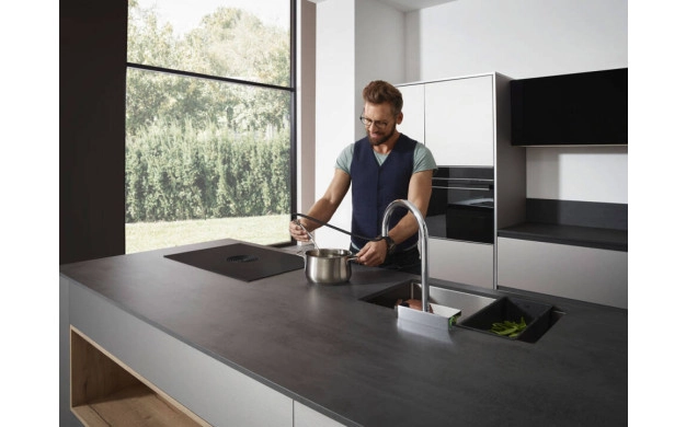 • SBox спестява място под мивката. Той прибира маркуча на изтеглящия се кухненски кран обратно в изходното му положение тук. За по-плавни работни потоци, повече защита и по-подреден шкаф.