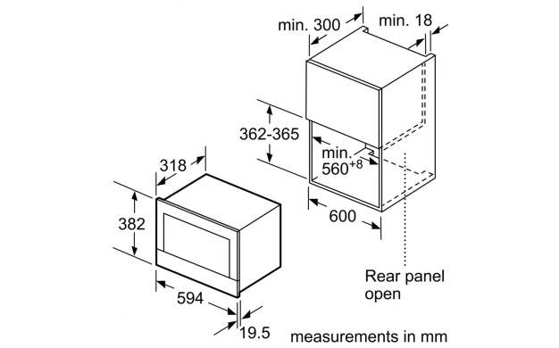 • Размери на нишата (В x Ш x Д): 560 мм – 568 мм x 362 мм – 382 мм x 300 мм