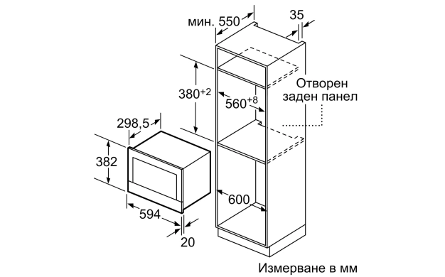 • Размери на нишата (В x Ш x Д): 560 мм – 568 мм x 362 мм – 382 мм x 300 мм