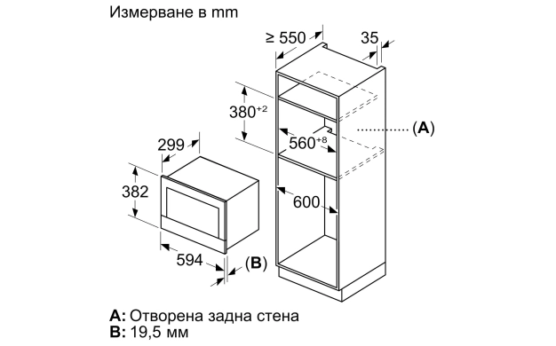 • Размери на нишата (В x Ш x Д): 560 мм – 568 мм x 362 мм – 382 мм x 300 мм