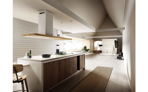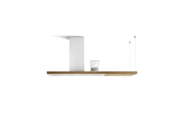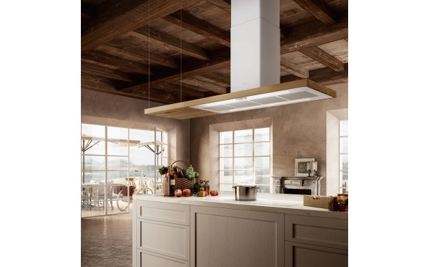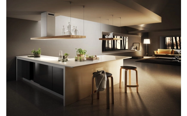 • Островен аспиратор с оригинален дизайн, наличен в матово бяло или матово черно покритие, допълнено от специални акценти от дъбово дърво.