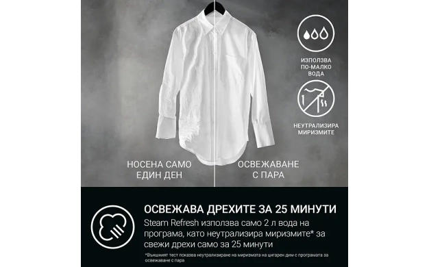 Steam Refresh неутрализира миризмите* и намалява гънките на дрехите включително на деликатните само за 25 минути. И ако искате допълнителна свежест, просто добавете от нашия аромат за пара. Придава свежест и усещане за току-що изпрано.