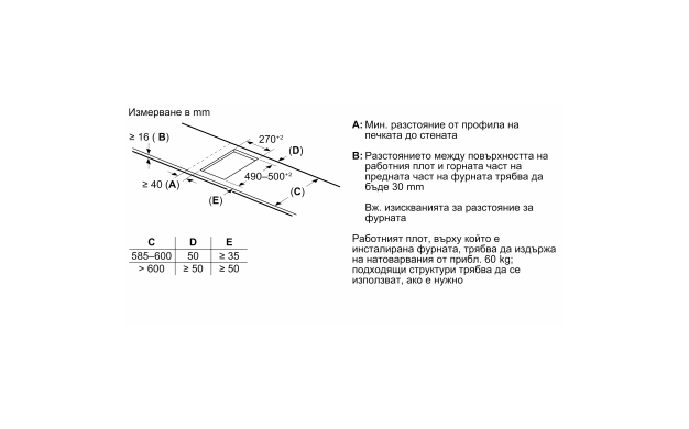 • Необходим размер на нишата за монтаж (ВxШxД mm) : 51 x 270 x (490 – 500)