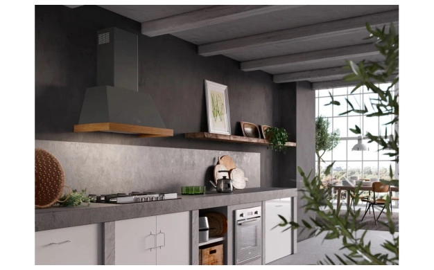 THEA е от моделите, които „обличат“ кухнята – декоративната форма, рустик линиите и тъмно сивото матово покритие стоят премиум както в модерни интериори с индустриално излъчване, така и в класически кухни с дървени фронтове и каменни плотове. Ако търсите аспиратор, който да не се „скрива“, а да допълни стила с характер – това е точният клас.