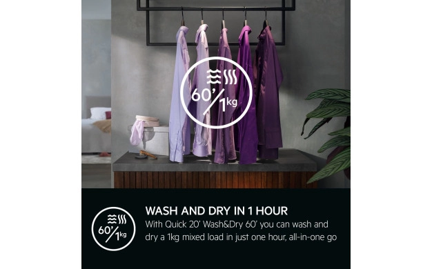 С Бързо пране 20' и сушене 60' можете да изперете и изсушите смесено пране от 1 кг само за един час, всичко наведнъж. Можете също така да изберете програма само за пране и да имате чисти дрехи само за 20 минути. Бърза и удобна грижа, когато бързате.