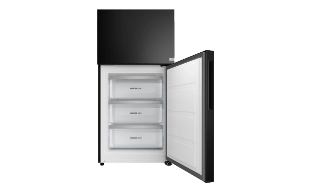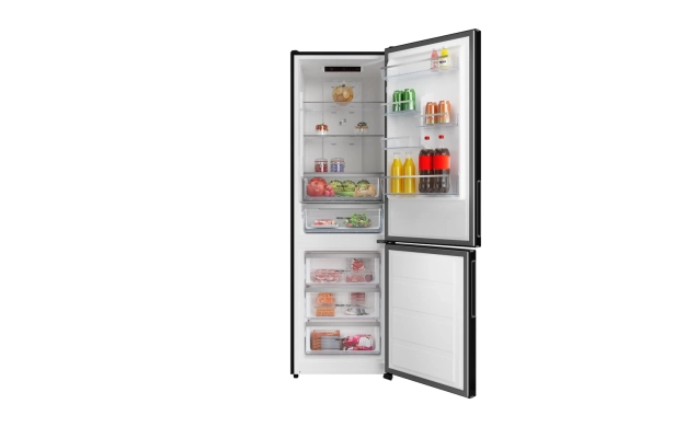 Моделът се отличава с черно покритие и характерен символ „T“ на вратата – фин детайл, който придава премиум усещане. Вътре ще намерите обезопасени стъклени полици с метална предна рамка и логична организация на пространството.
